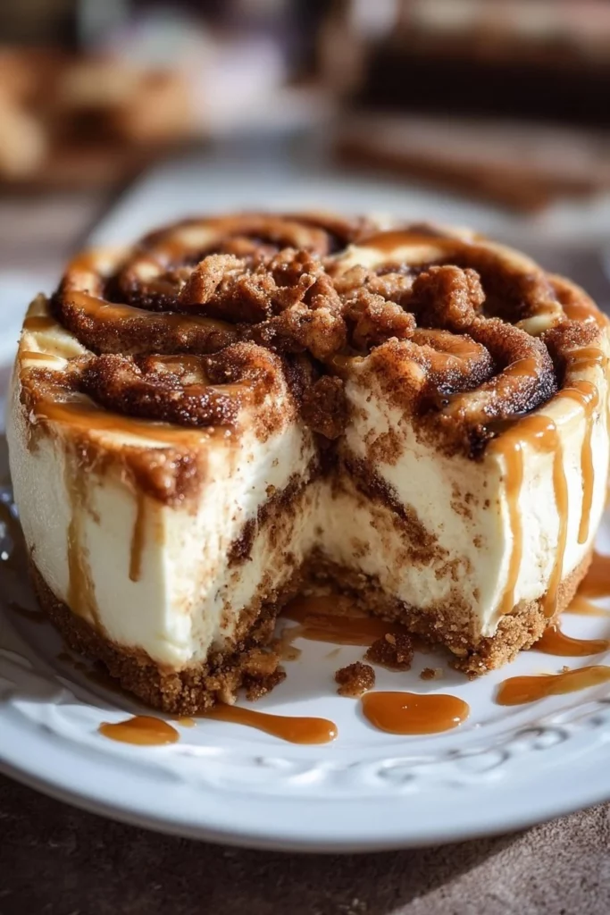 A rich and creamy cheesecake infused with the delightful flavors of cinnamon rolls, perfect for dessert lovers.