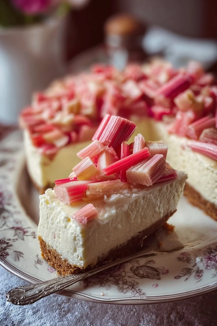 A delicious Rhubarb Cheesecake with a creamy filling and a sweet rhubarb topping.
