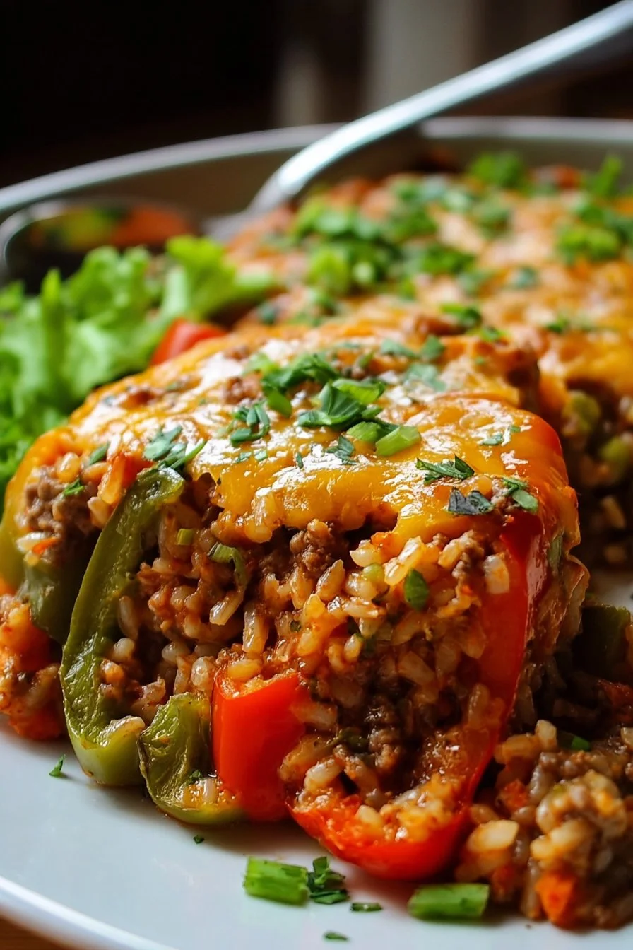 Stuffed Pepper Casserole is a delicious one-dish meal that combines ground beef, rice, and bell peppers, topped with melted cheese.